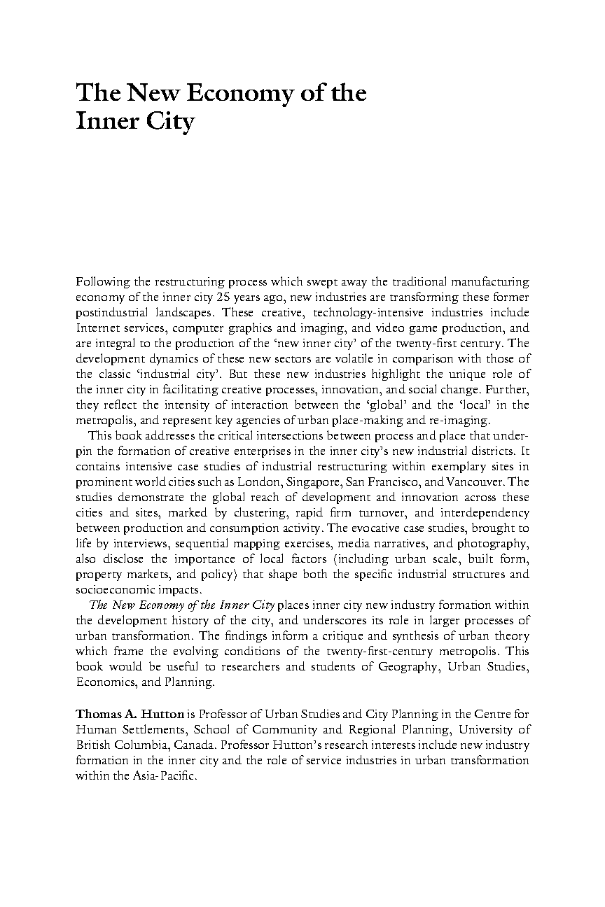 The New Economy of the Inner City: Restructuring, Regeneration, and Dislocation in the Twenty-First-Century Metropolis by Thomas A. Hutton