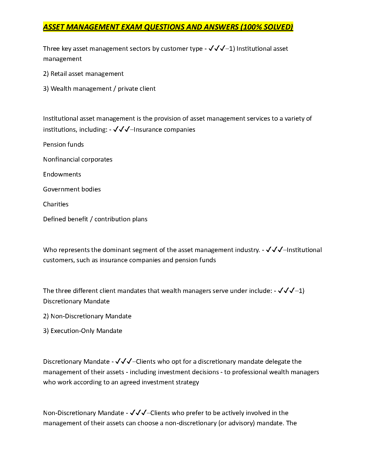 Ace your Asset Management exam on the first try with this comprehensive guide. This 2024/2025 edition provides 100% solved exam questions and answers, covering key topics like institutional, retail, and wealth management, and various client mandates. Perfect for students aiming to avoid resits.