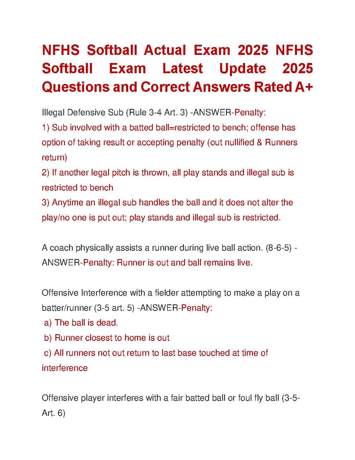 NFHS Softball Exam 2025: Questions and Correct Answers Rated A+ by [Author Names not available from the provided text, requires online search]