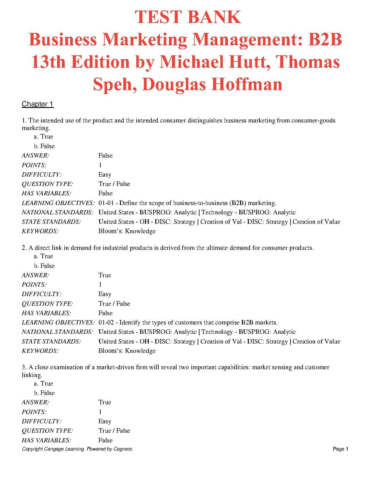 Business Marketing Management: B2B - 13th Edition Test Bank by Michael D. Hutt, Thomas C. Speh, and David A. Hoffman