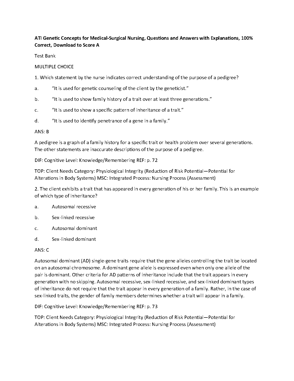 ATI Genetic Concepts for Medical-Surgical Nursing, Questions and Answers with Explanations, 100% Correct, RATED A+