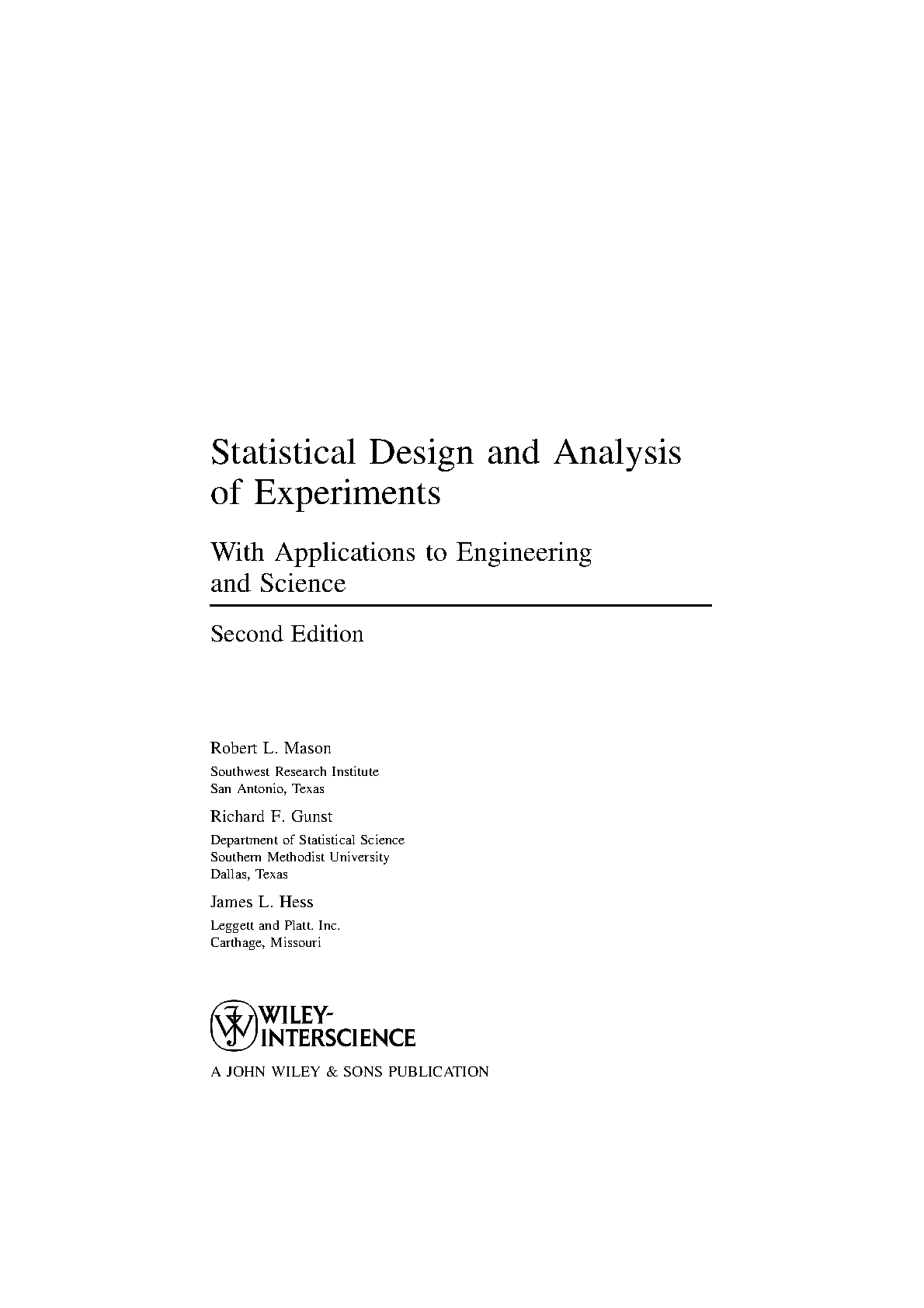 Statistical Design and Analysis of Experiments, Second Edition by Robert L. Mason, Richard F. Gunst, and James L. Hess