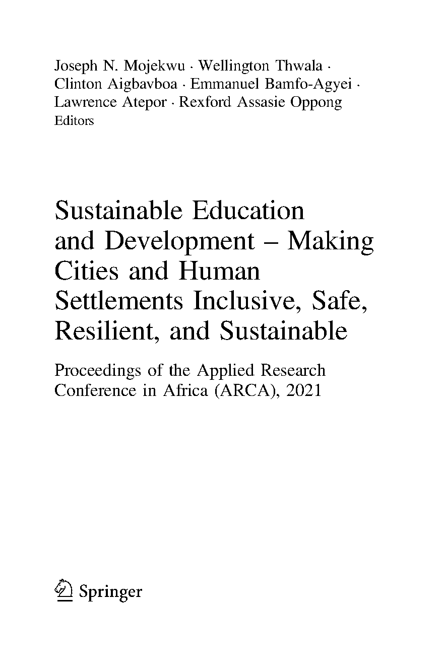Sustainable Education and Development – Making Cities and Human Settlements Inclusive, Safe, Resilient, and Sustainable: Proceedings of the Applied Research Conference in Africa (ARCA), 2021, Edited by Joseph N. Mojekwu, Wellington Thwala, Clinton Aigbavb