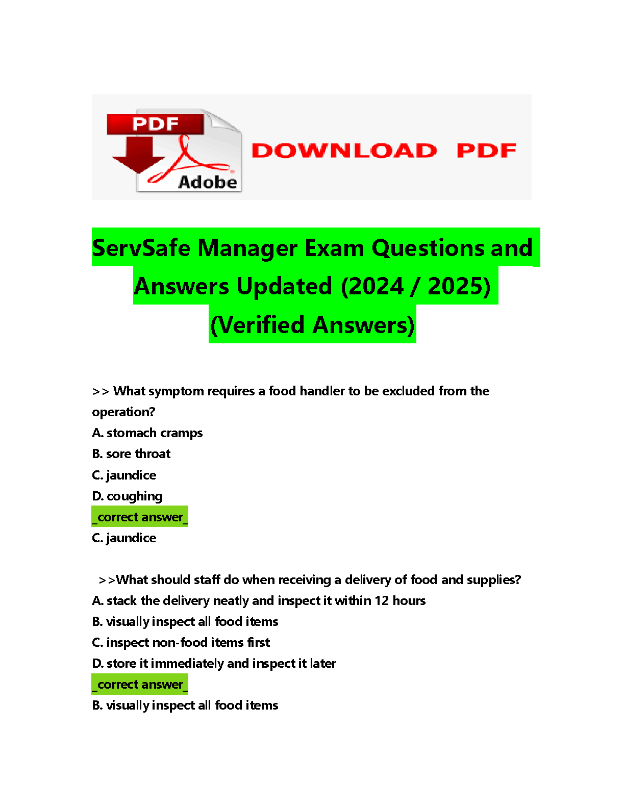 ServSafe Manager Exam Questions and Answers 2024/2025: Updated Edition with Verified Answers by National Restaurant Association