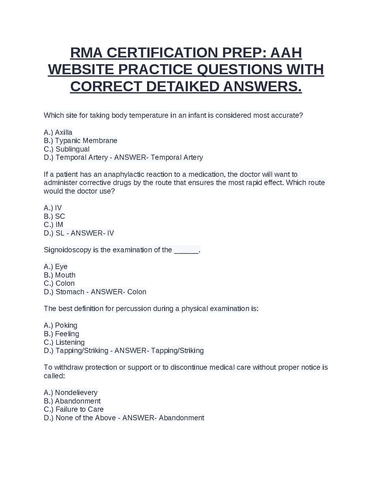 RMA Certification Prep: AAH Website Practice Questions with Correct Detailed Answers