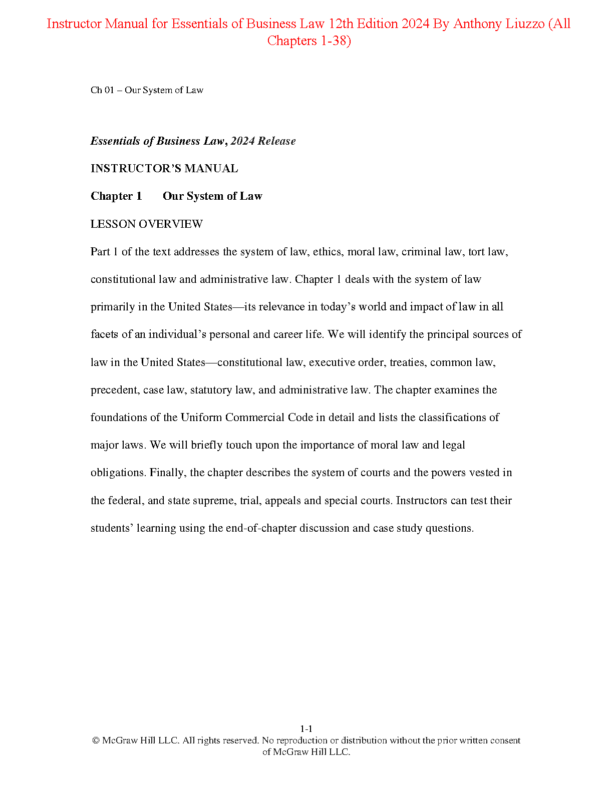 Access the complete Instructor's Manual for Essentials of Business Law, 12th Edition, 2024 release by Anthony Liuzzo. This resource is designed to help instructors effectively teach the course content and assess student learning with end-of-chapter discussion and case study questions. Prepare your students for exam success!