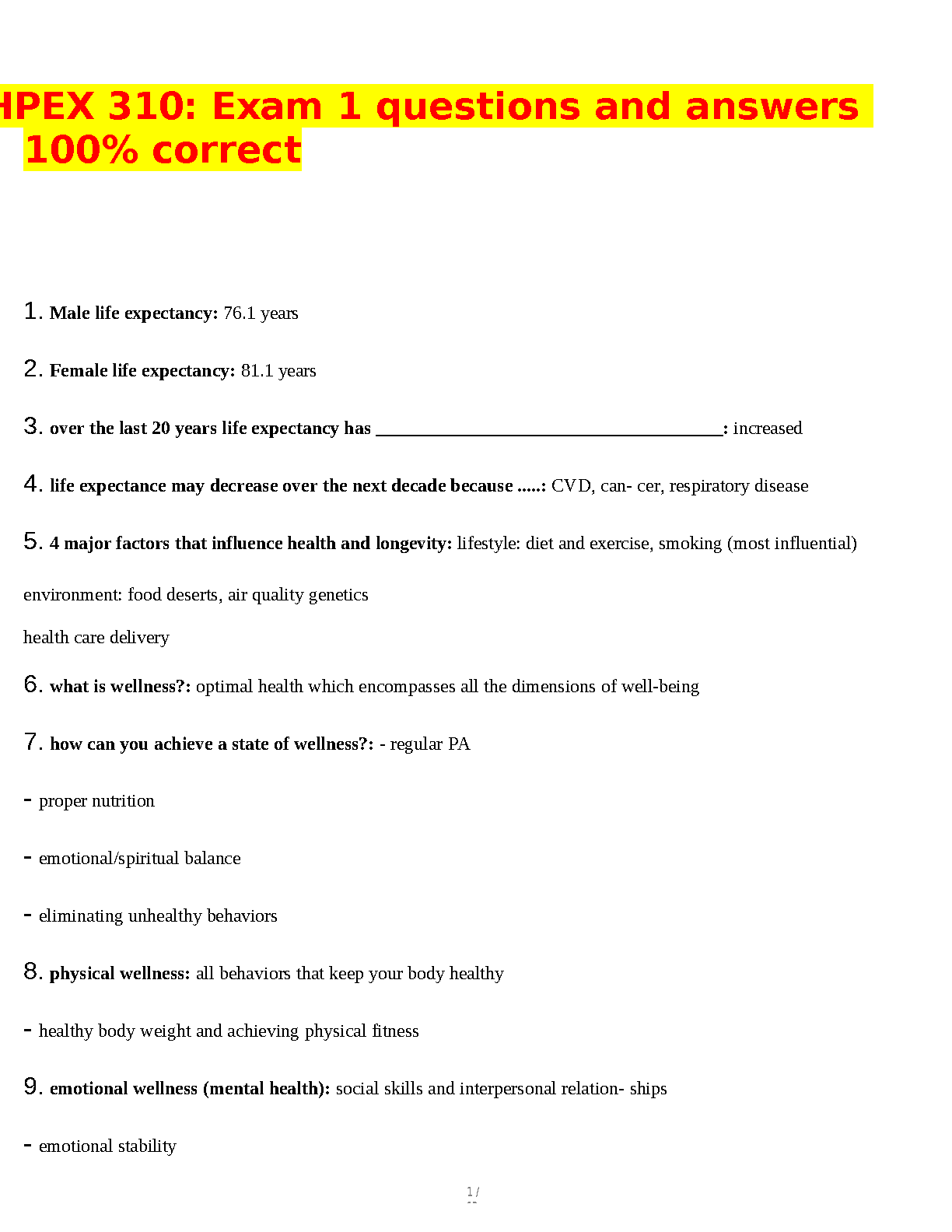 HPEX 310 Exam 1 Questions and Answers: A 2024-2025 Guide to Ace Your Exams on the First Attempt