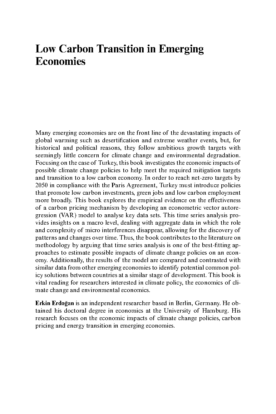 Explore the complexities of low-carbon transitions in emerging economies with Erkin Erdoğan's insightful analysis. This book delves into climate policy, carbon pricing mechanisms, and their impact on employment, providing essential knowledge for students and professionals alike.