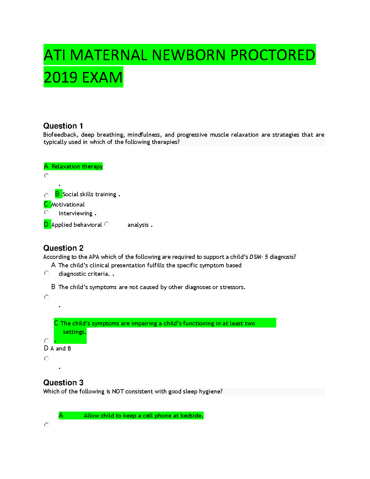 ATI MATERNAL NEWBORN PROCTORED 2019 EXAM RECENTLY UPDATED WITH CORRECT ANSWERS 2023