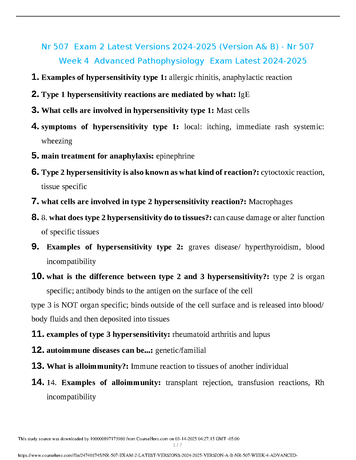 Ace your Nr 507 Exam 2 with this comprehensive study guide covering hypersensitivity reactions, alloimmunity, and more. Designed for the 2024-2025 academic year, this resource helps you avoid resits and pass on your first attempt.