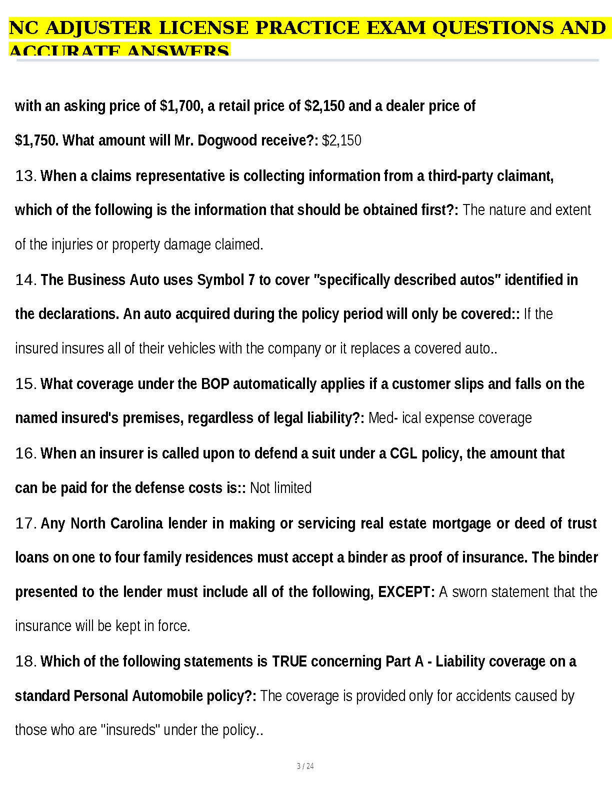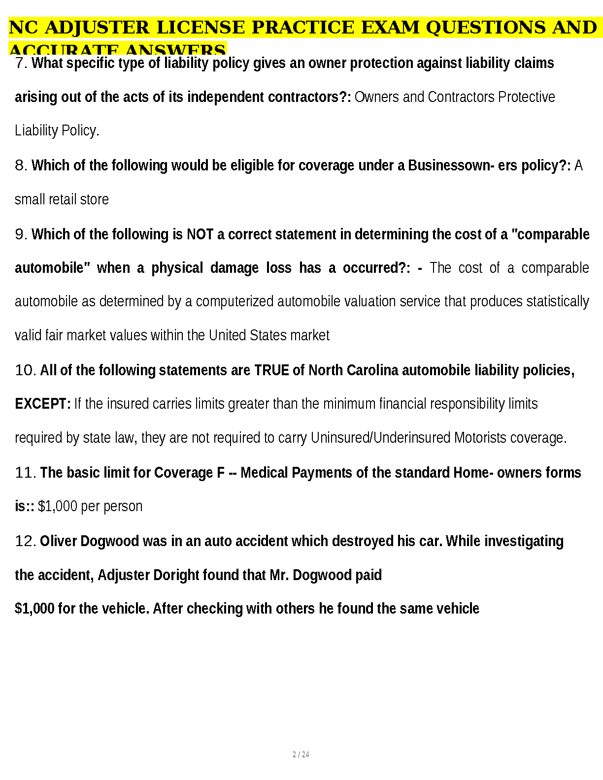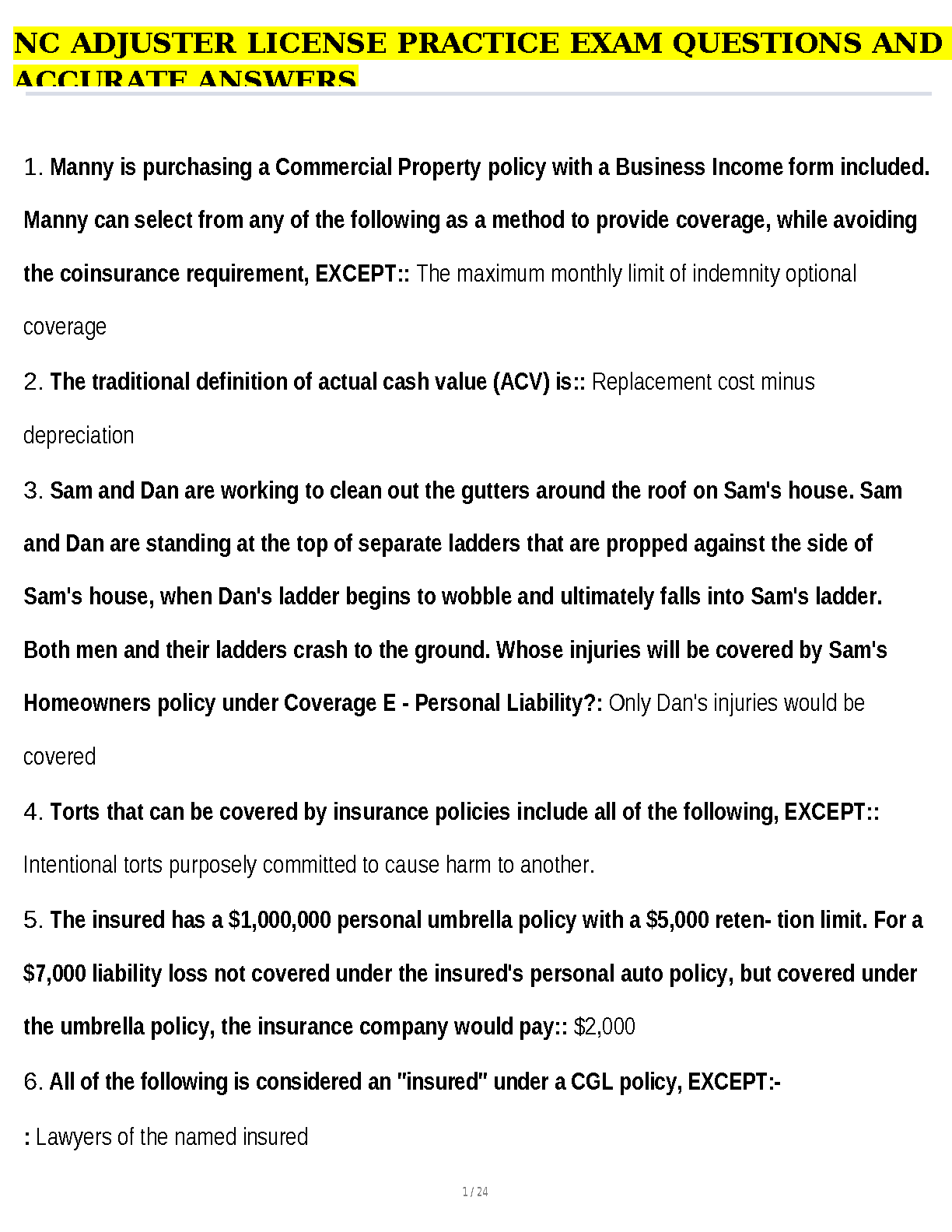 NC Adjuster License Exam Practice Questions and Accurate Answers: 2024/2025 Edition