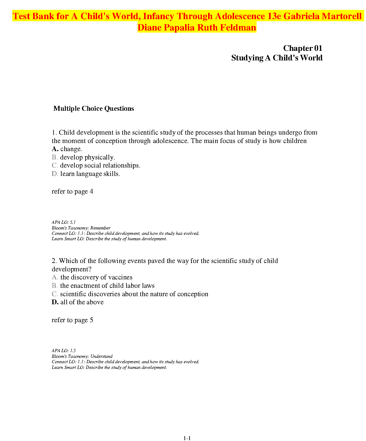 This Test Bank for A Child's World, Infancy Through Adolescence, 13th Edition, by Martorell, Papalia, and Feldman offers comprehensive resources to help students master the course material and ace their exams. Prepare effectively for your assessments and avoid resits with this invaluable study companion.