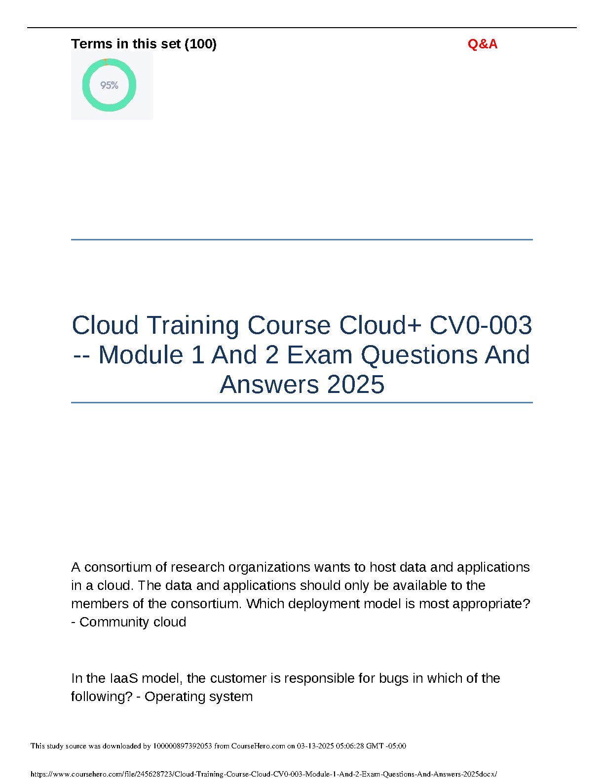 Ace your Cloud+ CV0-003 exam with this comprehensive study guide covering Modules 1 and 2. This resource contains exam questions and answers to help you pass on your first attempt. Perfect for students aiming for exam success in 2024/2025.