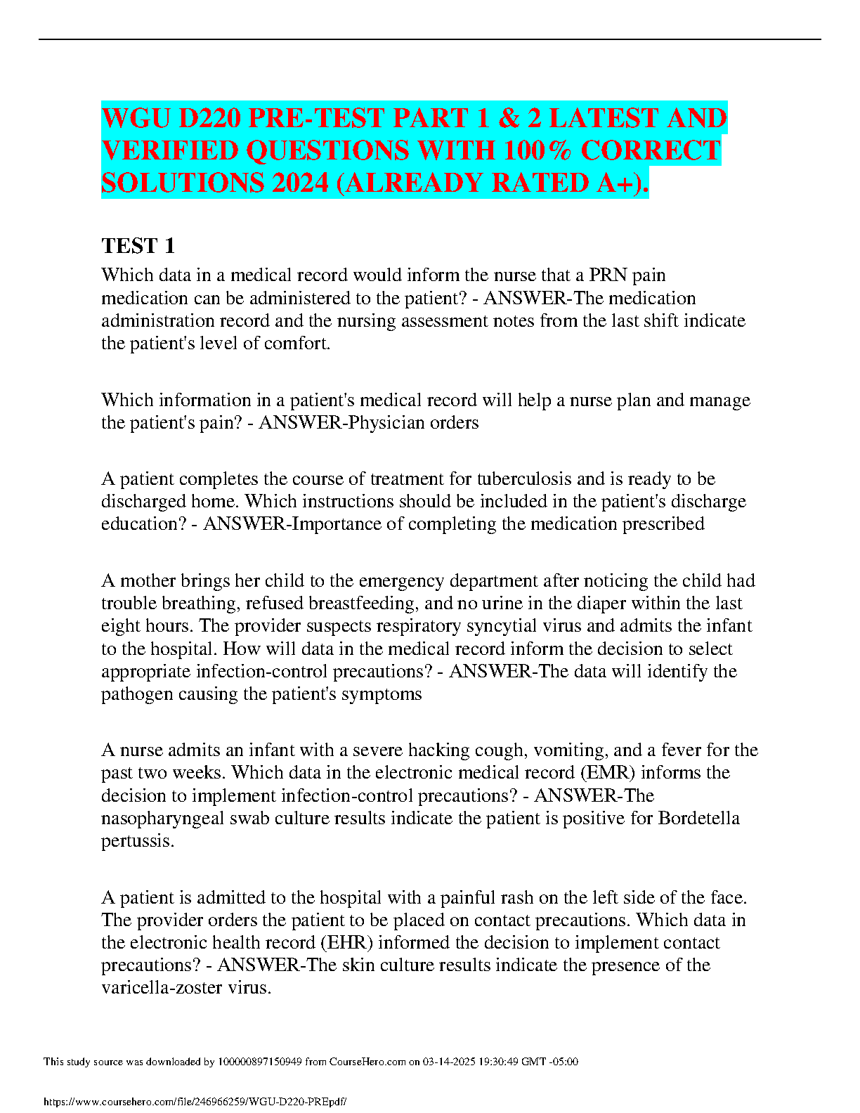 WGU D220 Pre-Test Part 1 & 2: Latest Verified Questions & Solutions 2024-2025 by [Author Names Unavailable]