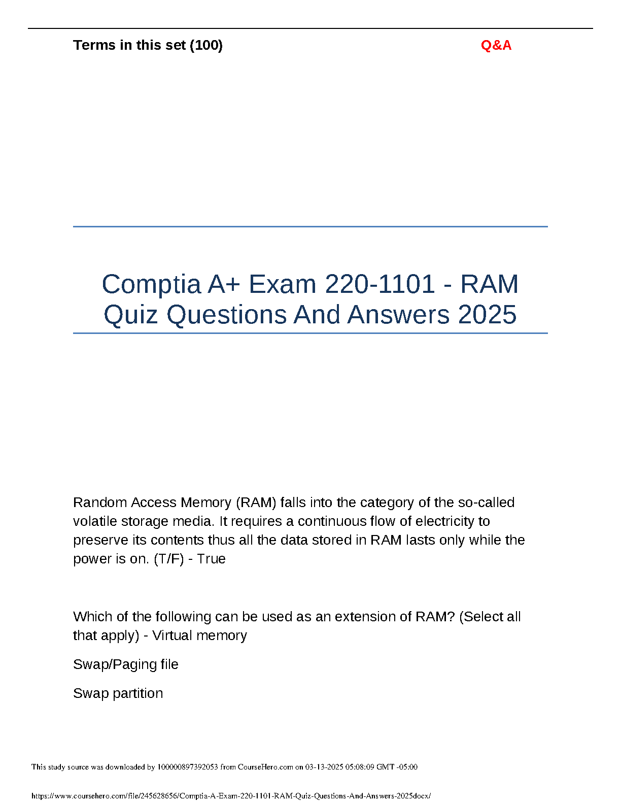 Comptia A+ Exam 220-1101 RAM Quiz Questions and Answers 2025