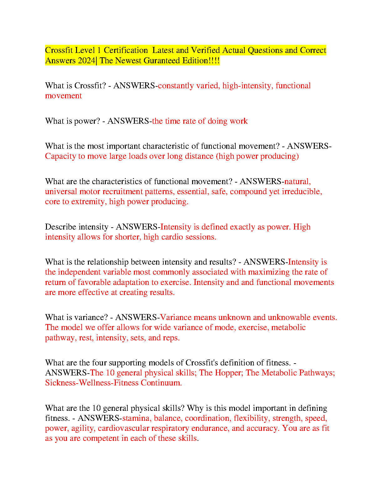 CrossFit Level 1 Certification: Latest and Verified Actual Questions and Correct Answers 2024 Edition by Unknown Author