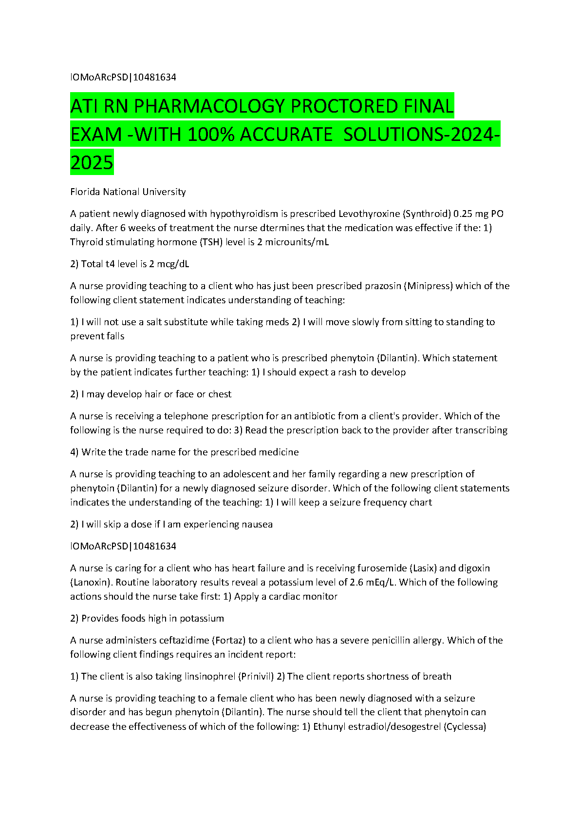 ATI RN Pharmacology Proctored Final Exam with 100% Accurate Solutions 2024-2025 by Unknown Author