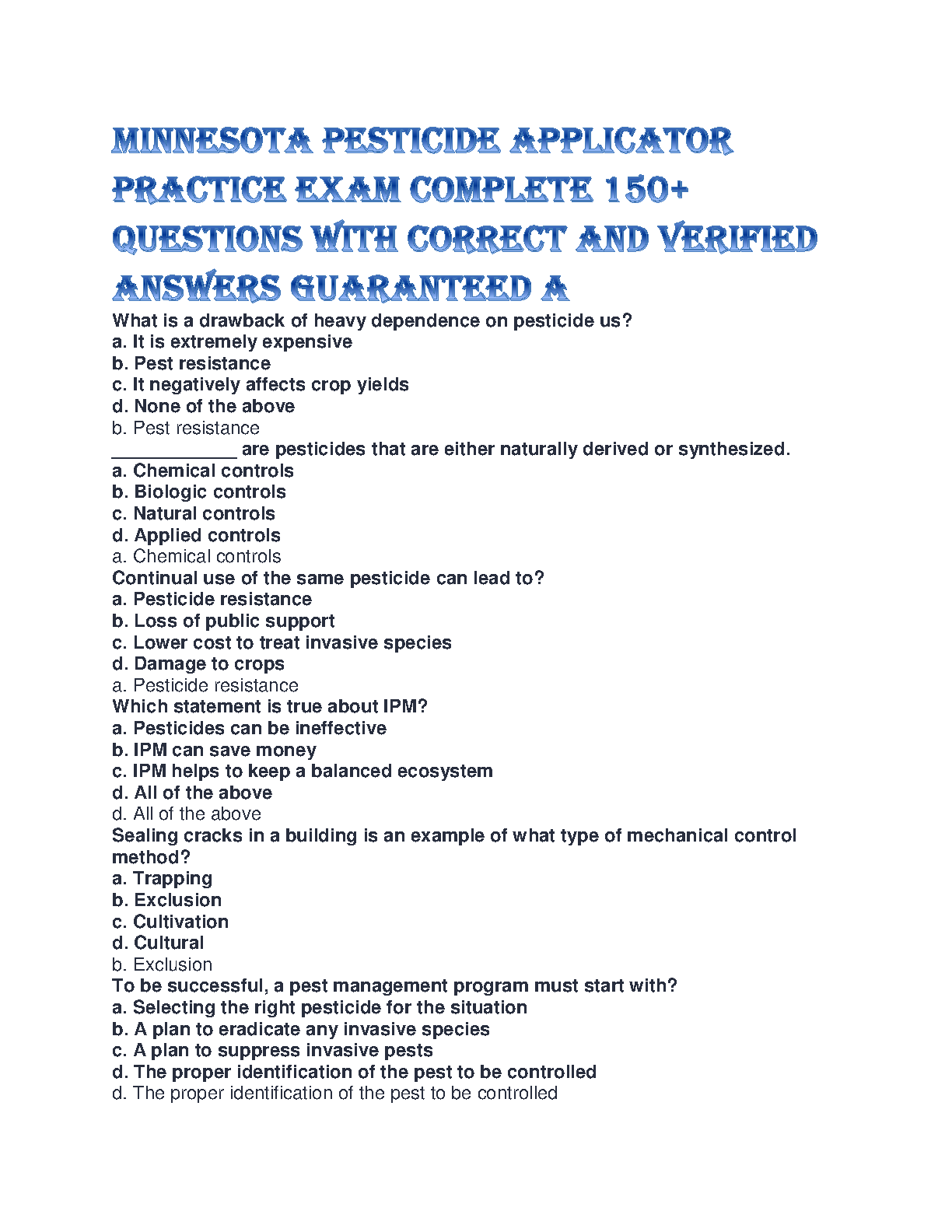 Ace your Minnesota Pesticide Applicator exam on the first try with this comprehensive practice exam featuring 150+ verified questions and answers. This 2024/2025 edition guarantees success, eliminating the need for resits.