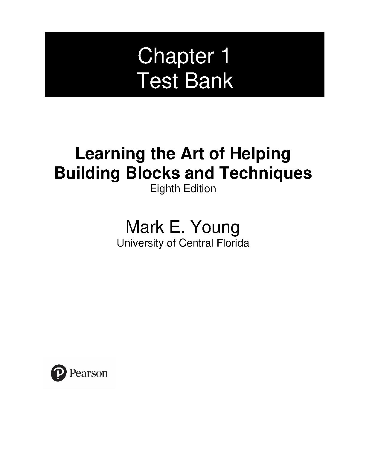 Access the complete test bank for the Eighth Edition of Learning the Art of Helping: Building Blocks and Techniques by Mark E. Young. This resource provides instructors with a comprehensive set of assessment tools to evaluate student understanding. Prepare your students for success with this invaluable resource.