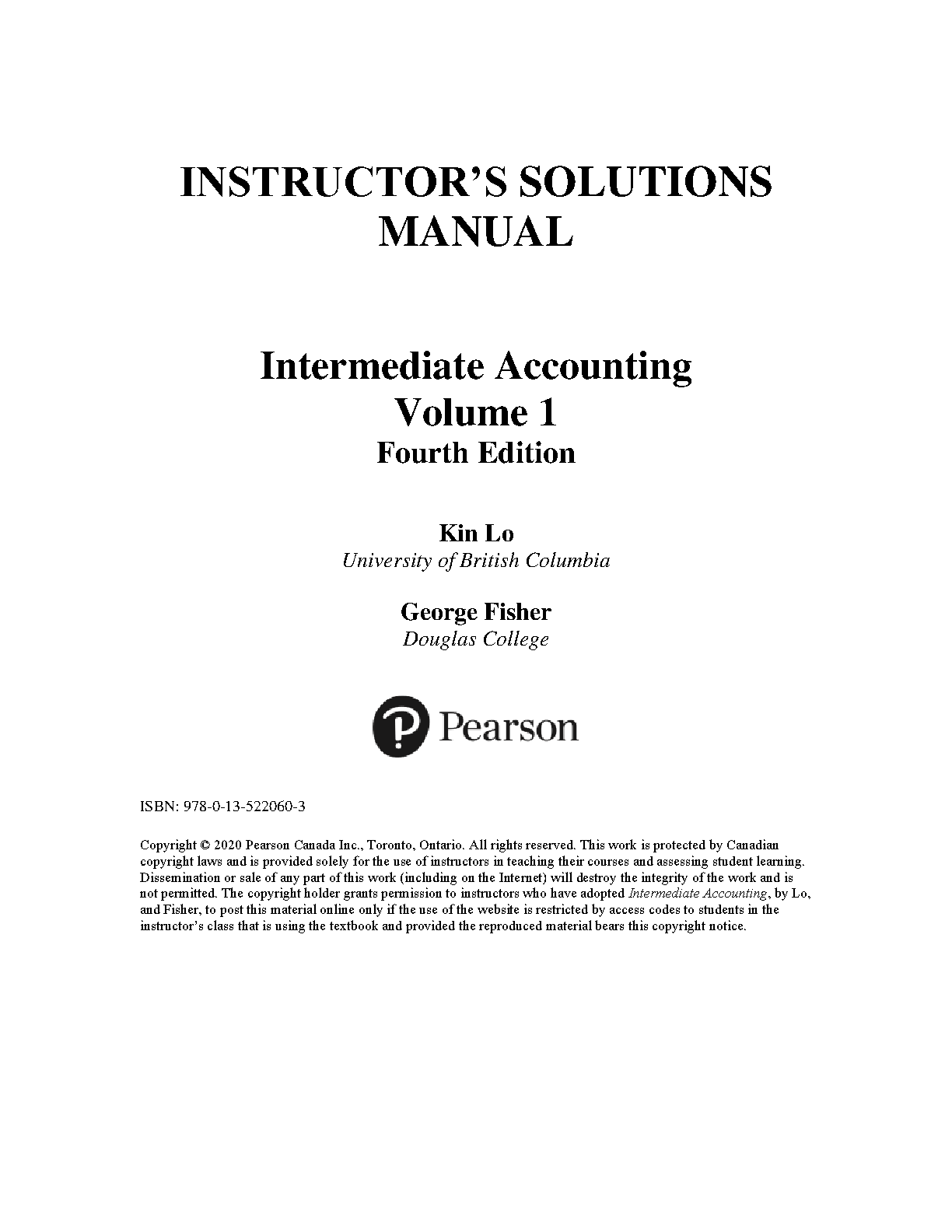 Access the complete solutions manual for Intermediate Accounting, Volume 1, Fourth Edition, authored by Kin Lo and George Fisher. This resource is invaluable for instructors teaching the course and for students aiming to master the subject matter. Gain a comprehensive understanding of the concepts and ace your exams on the first attempt.