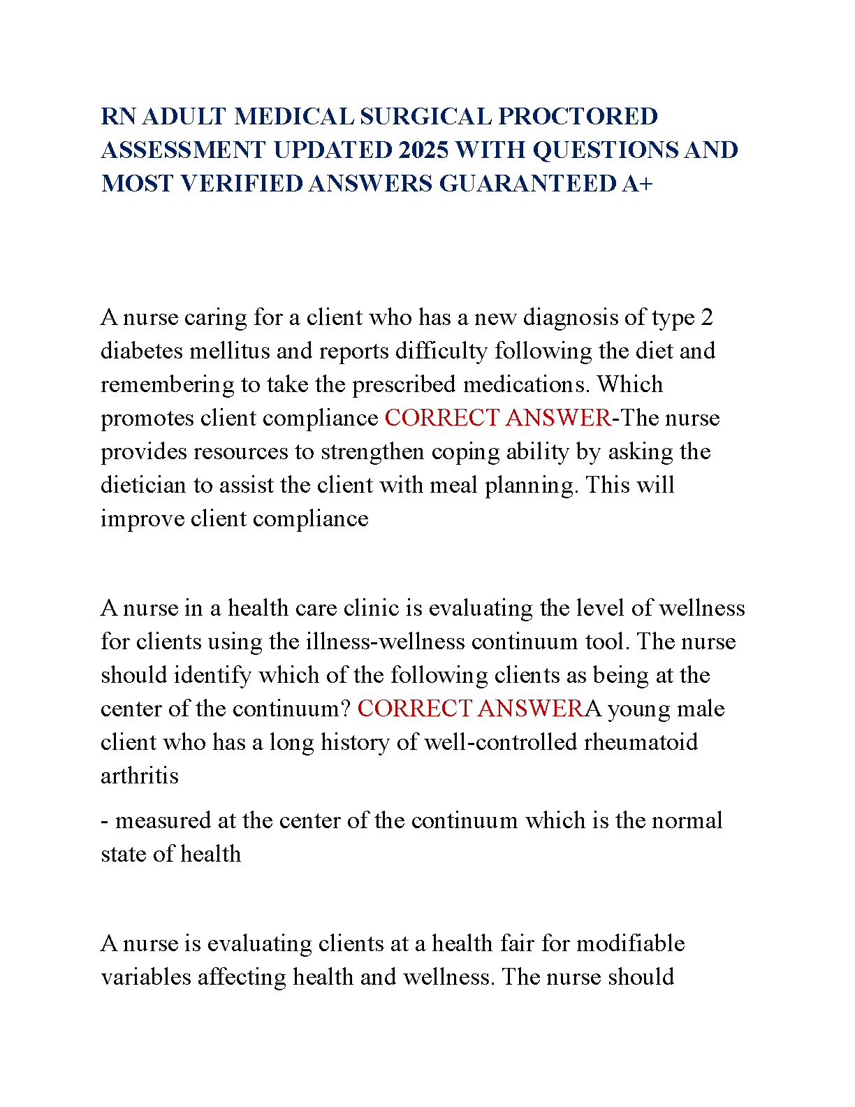 RN Adult Medical Surgical Proctored Assessment 2025: Updated Questions and Verified Answers for Guaranteed A+ by [Author names not found in the provided text. Further online search is needed to identify the author]