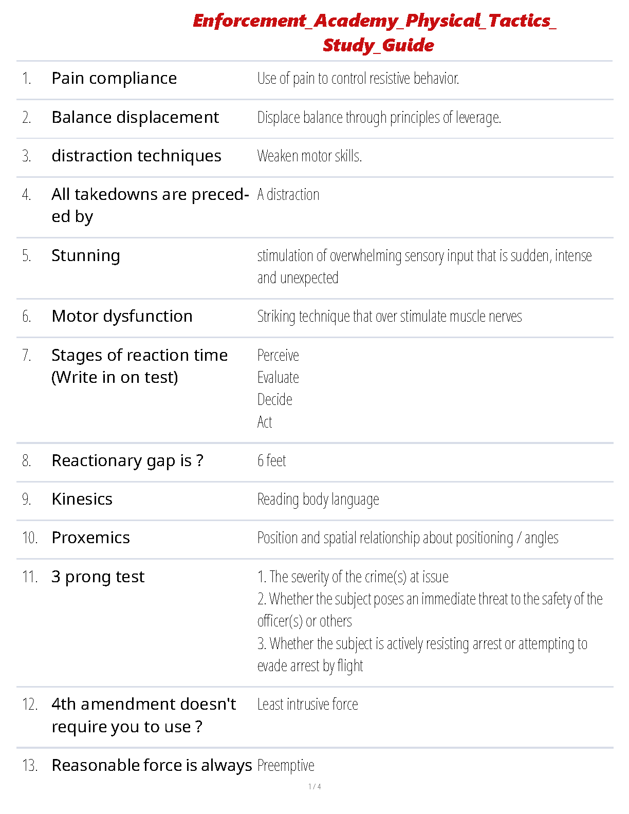 Master physical tactics with this Enforcement Academy study guide, designed to help students ace their exams on the first try. Covering key concepts like pain compliance, balance displacement, and reaction time, this resource ensures exam readiness and avoids resits.