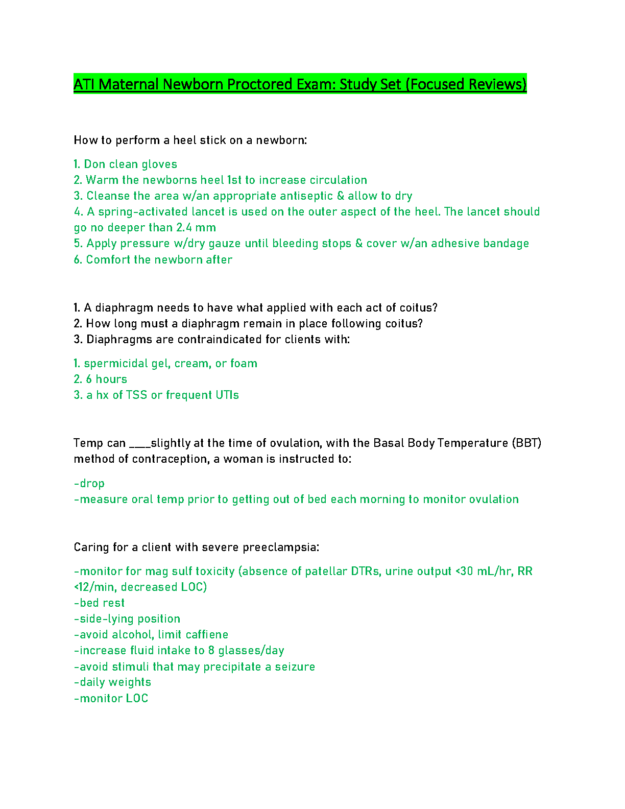 ATI Maternal Newborn Proctored Exam: Study Set (Focused Reviews) 100% CORRECT AND APPROVED BY EXPERT