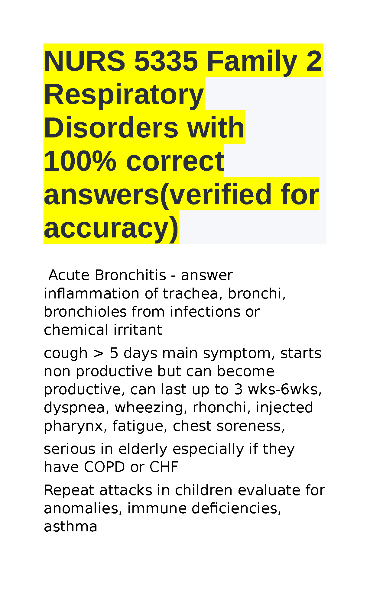Ace your NURS 5335 Family 2 Respiratory Disorders exam with this comprehensive study guide. Get 100% correct answers verified for accuracy, ensuring you pass on your first try and avoid resits. This resource covers key concepts and helps you master the material efficiently.