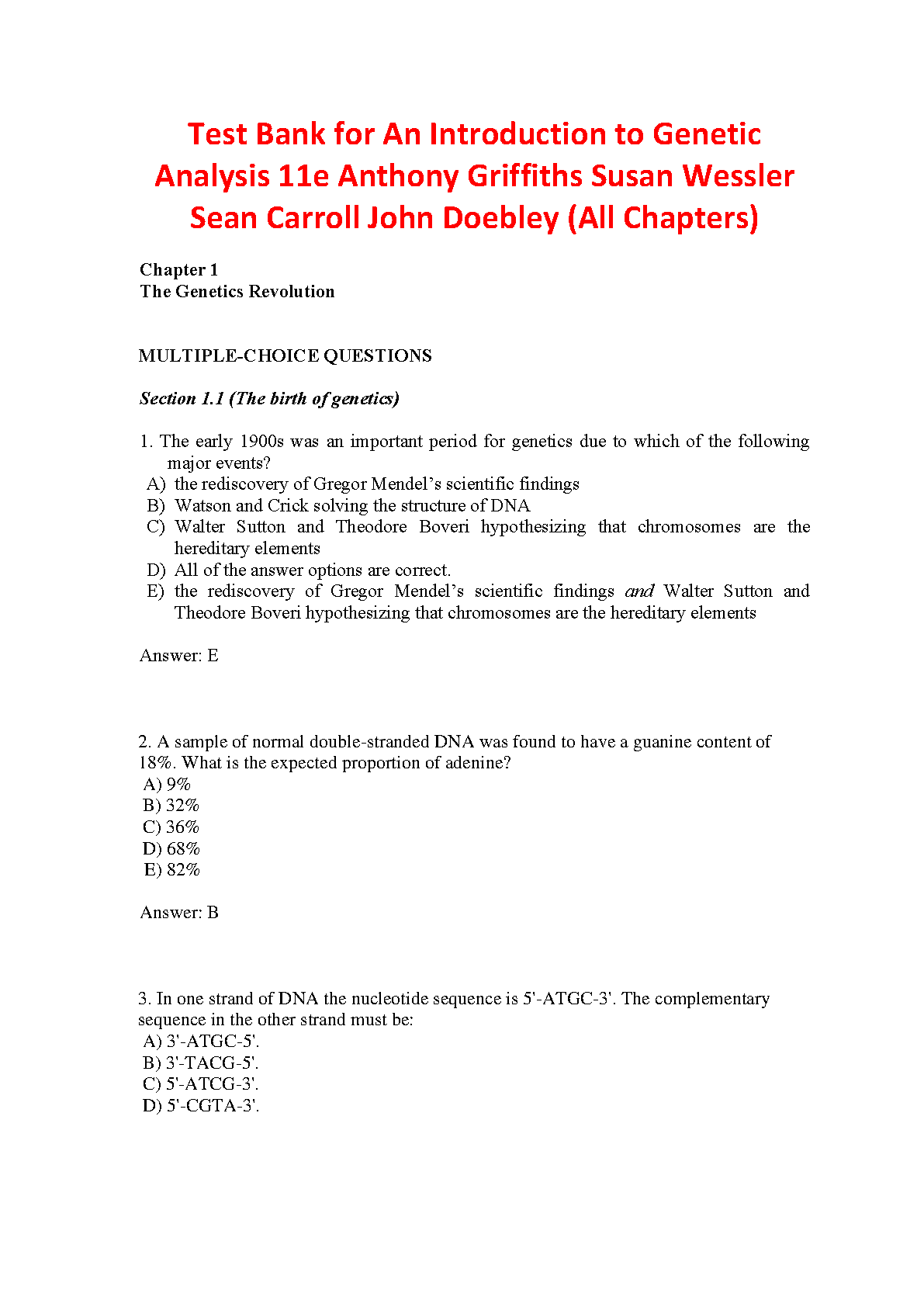 Test Bank: An Introduction to Genetic Analysis 11th Edition by Anthony Griffiths, Susan Wessler, Sean Carroll, and John Doebley