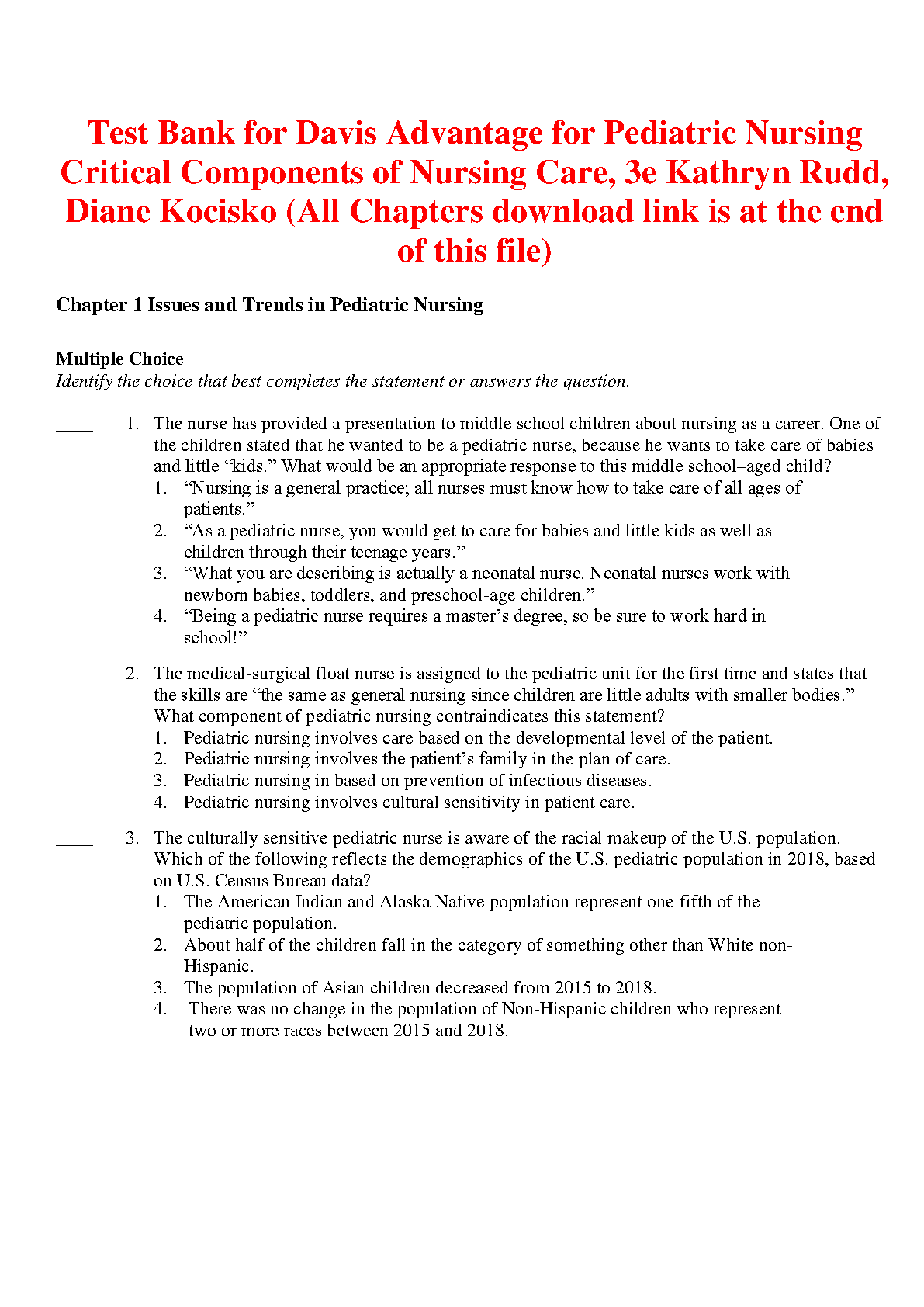 Davis Advantage for Pediatric Nursing: Critical Components of Nursing Care, 3rd Edition, by Kathryn Rudd and Diane Kocisko - Test Bank