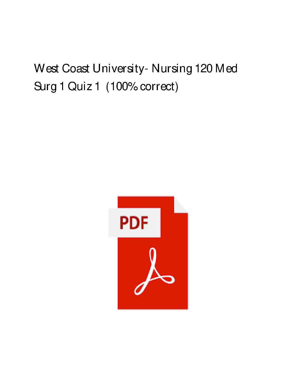 Ace your West Coast University Nursing 120 Med Surg 1 Quiz 1 with this comprehensive solution guide. Guaranteed to help you achieve a perfect score and avoid resits. Download now and conquer your exams!