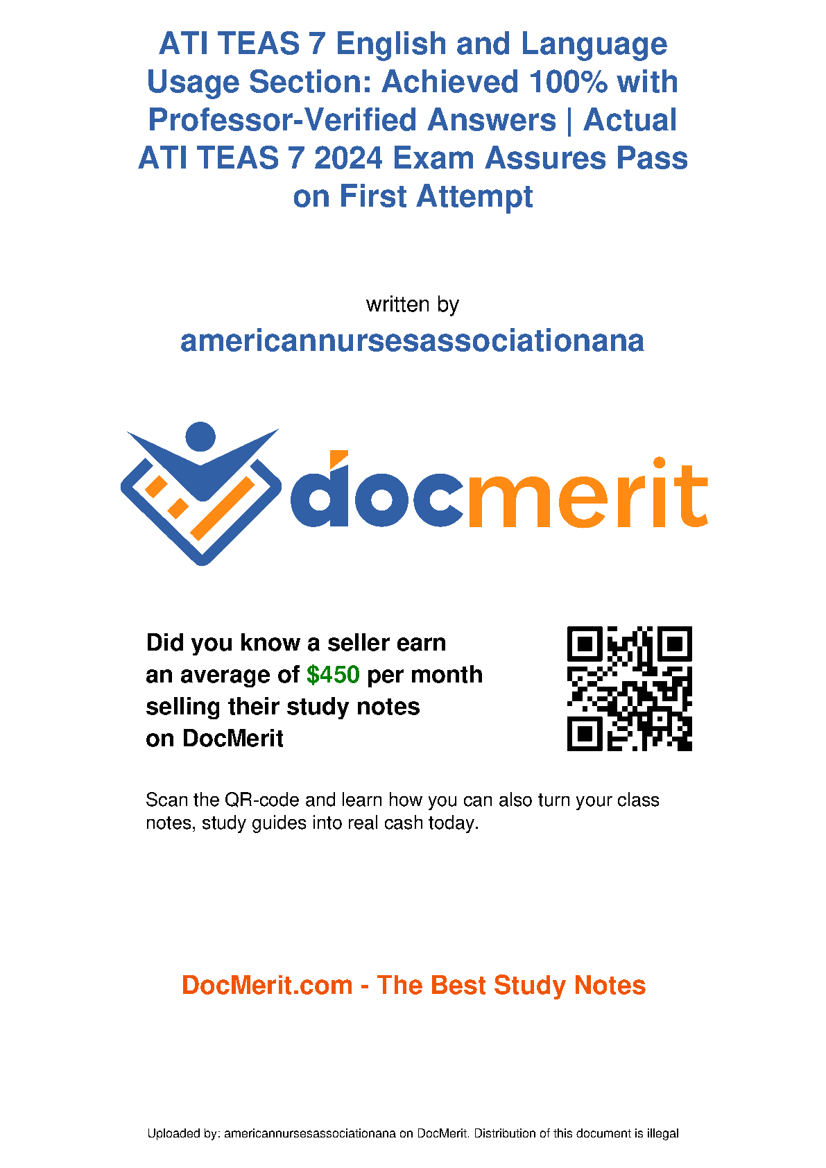 ATI TEAS 7 English and Language Usage Section: 2024 Edition - Achieved 100% with Professor-Verified Answers by american nurses association
