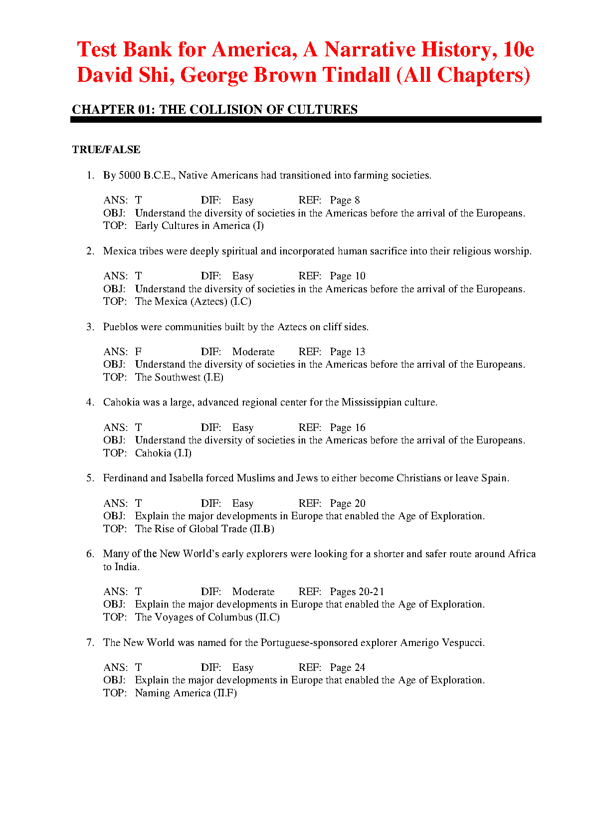 This is a comprehensive test bank for America, A Narrative History, 10th edition, by David Shi and George Brown Tindall. It covers all chapters and provides a variety of question types to help students prepare for exams and succeed on their first attempt, avoiding resits.