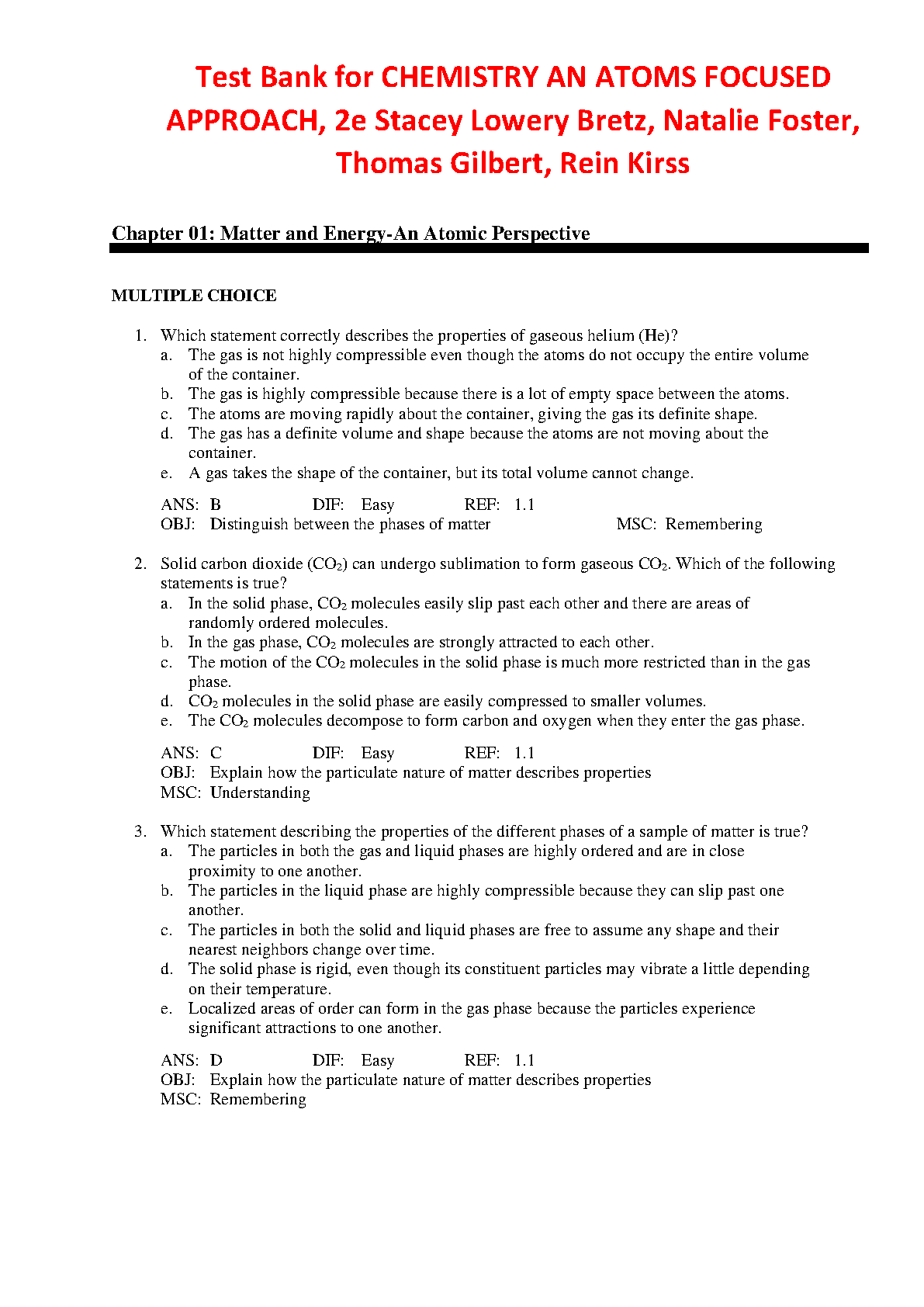 Ace your Chemistry exam on the first try with this comprehensive Test Bank for Chemistry: An Atoms Focused Approach, 2e. This resource, curated by Stacey Lowery Bretz, Natalie Foster, Thomas Gilbert, and Rein Kirss, provides in-depth practice questions and answers to help you master key concepts and excel in your studies. Prepare effectively and avoid resits.