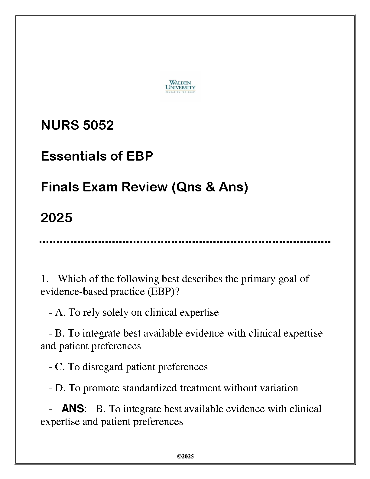 NURS 5052 Essentials of EBP Finals Exam Review (Questions & Answers) 2025 Edition by Walden University