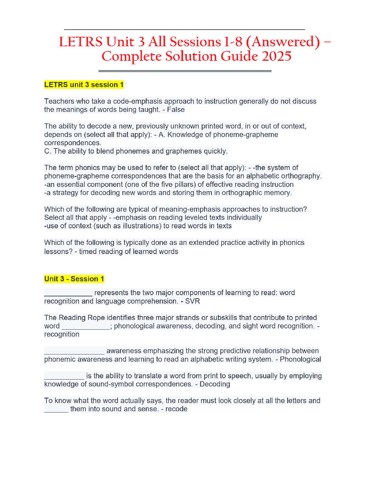 This comprehensive solution guide provides answers to all sessions (1-8) of LETRS Unit 3. Ideal for students aiming to ace their exams and avoid resits in the 2024/2025 academic year. This resource is designed to help you understand key concepts and improve your performance.