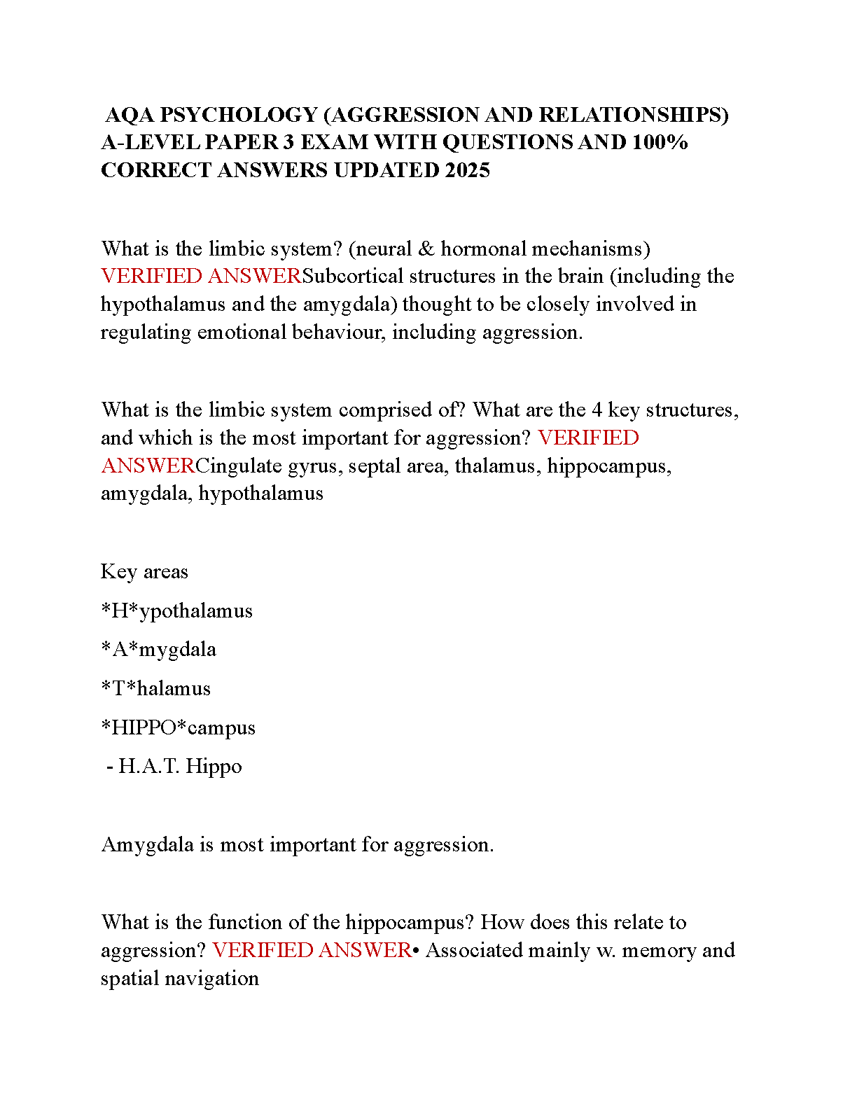 AQA Psychology A-Level Paper 3 Exam: Aggression and Relationships - Complete Answers Updated 2025 by Anonymous