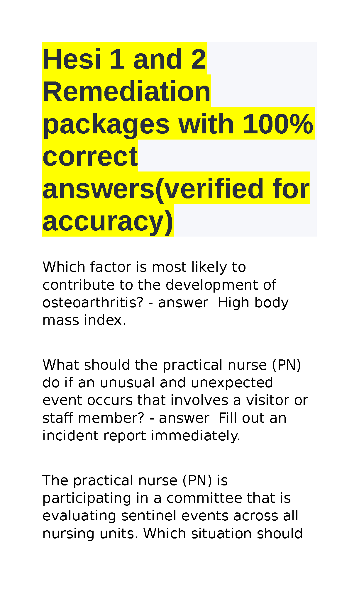 Ace your HESI exam with our comprehensive remediation packages for HESI 1 and 2. These packages contain 100% correct answers, verified for accuracy, to help you pass on your first attempt. Ideal for nursing students aiming to avoid resits.