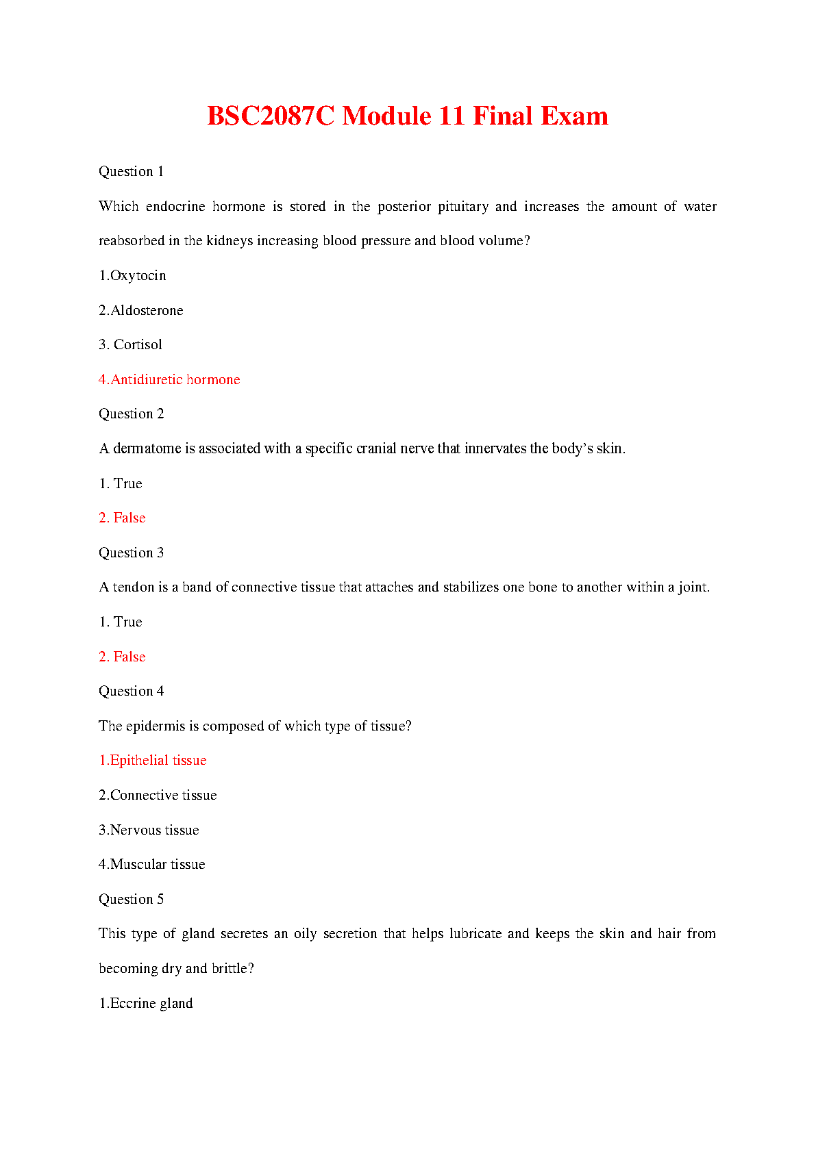 This study guide contains practice questions and answers for the BSC2087C Module 11 Final Exam. Designed to help students master the material and pass the exam on their first attempt, avoiding costly resits. Perfect for the 2024-2025 academic year.