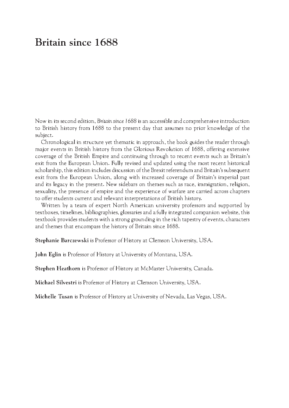 Ace your exams with this comprehensive guide to Britain Since 1688. This second edition, authored by Stephanie Barczewski, John Eglin, Stephen Heathorn, Michael Silvestri, and Michelle Tusan, provides in-depth coverage to help students master the material and avoid resits. Perfect for the 2024/2025 academic year.