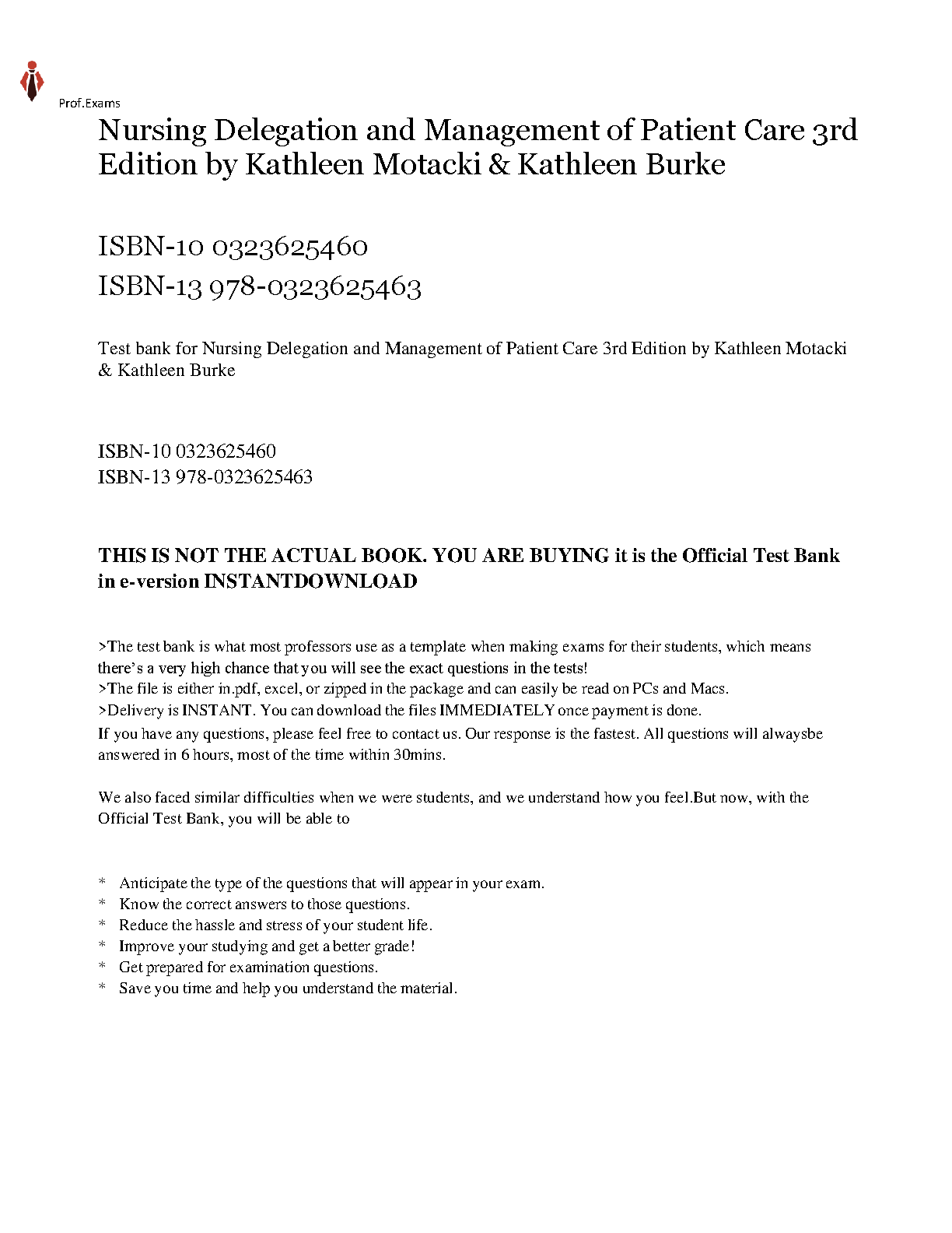 Test Bank for Nursing Delegation and Management of Patient Care, 3rd Edition by Kathleen Motacki and Kathleen Burke