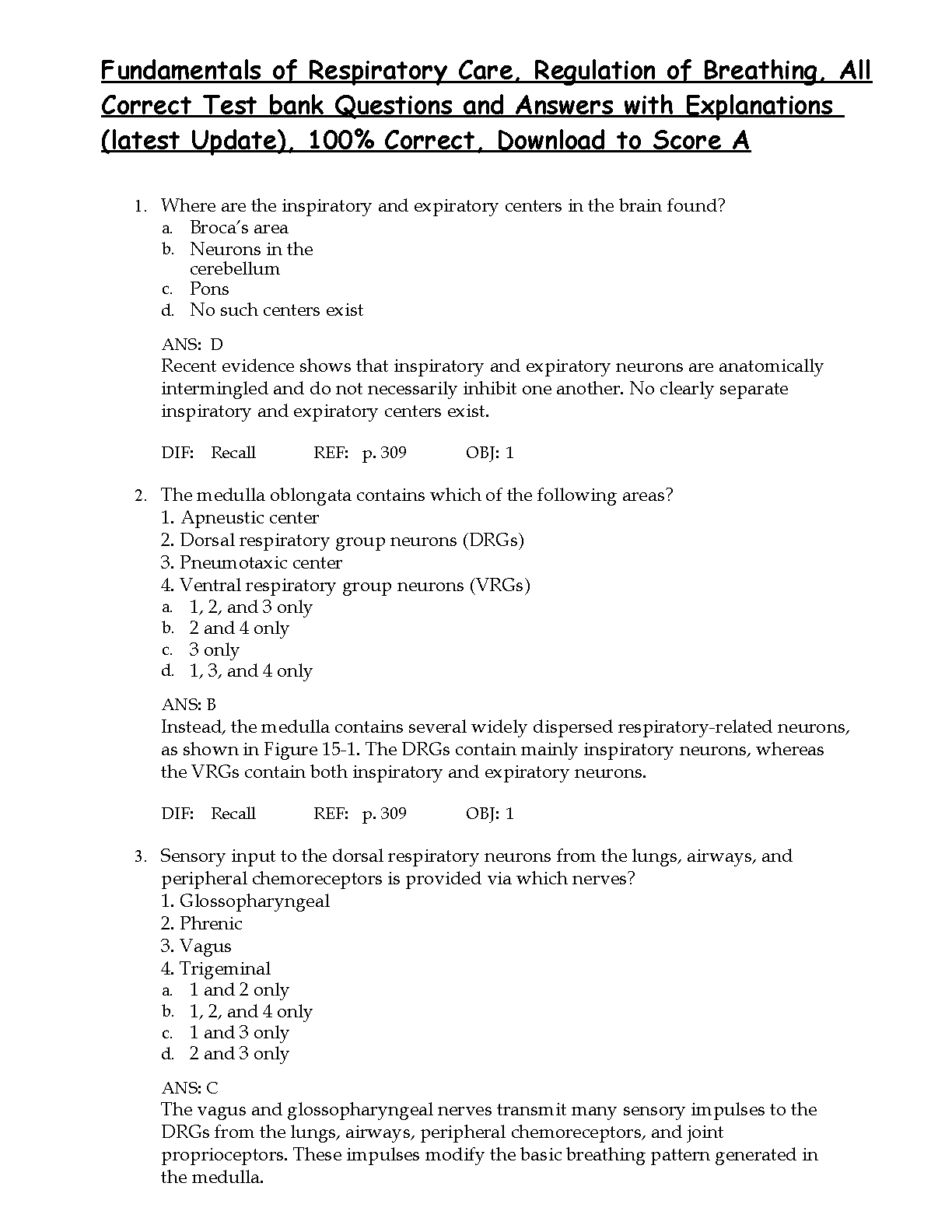 Fundamentals of Respiratory Care, Regulation of Breathing, All Correct Test bank Questions and Answers with Explanations (latest Update), 100% Correct, GRADED A+. DOWNLOAD on www.hackedexams.com INSTANTLY.