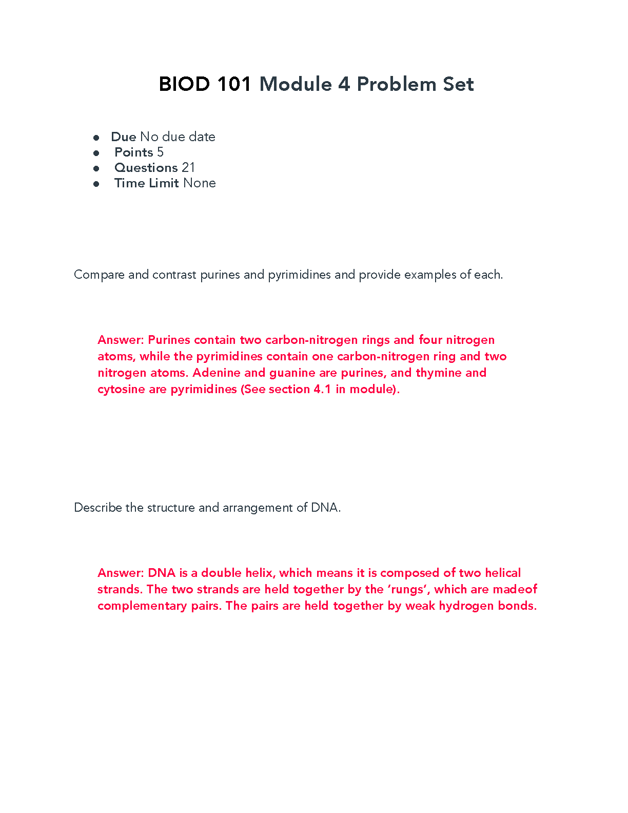 BIOD 101 Module 4 Problem Set: Purines, Pyrimidines, and DNA Structure
