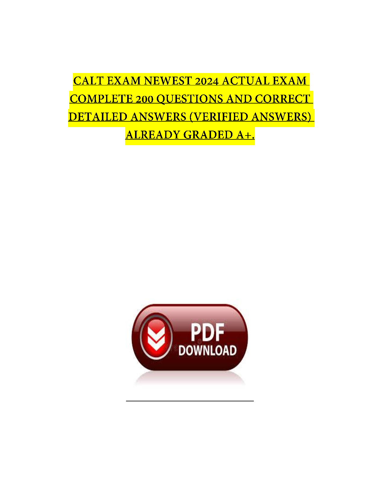 Ace your CALT exam on the first try with this comprehensive study guide. Featuring 200 detailed, verified answers, this resource is designed to help students achieve an A+ grade. Prepare effectively and confidently for your 2024/2025 CALT examination.