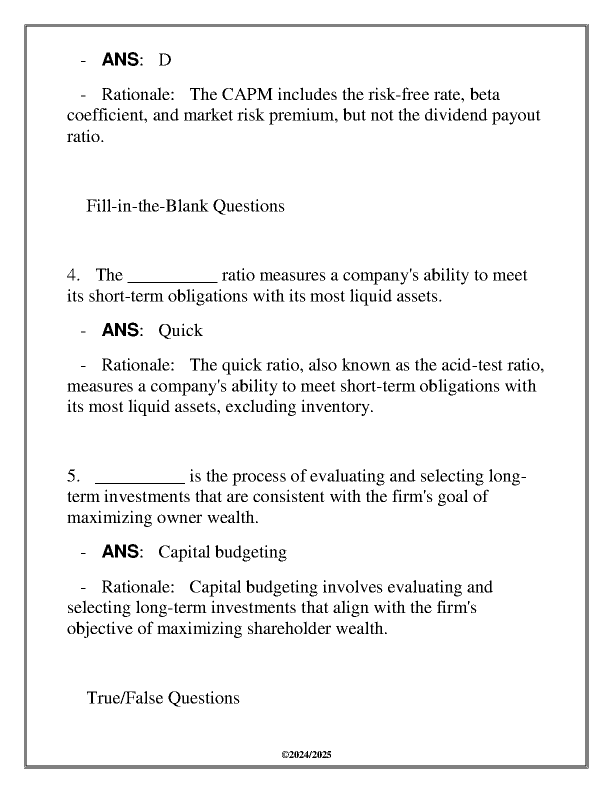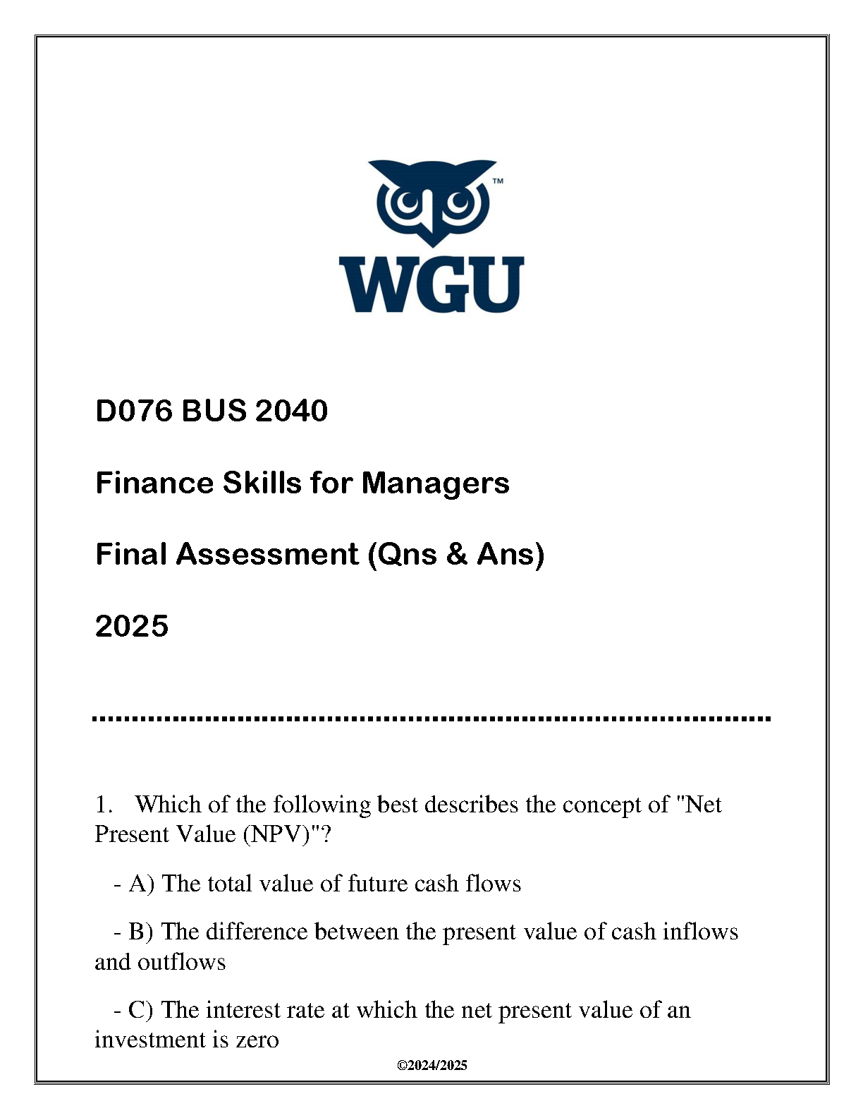 WGU D076 BUS 2040 Finance Skills for Managers: Final Assessment Questions & Answers 2025 Edition