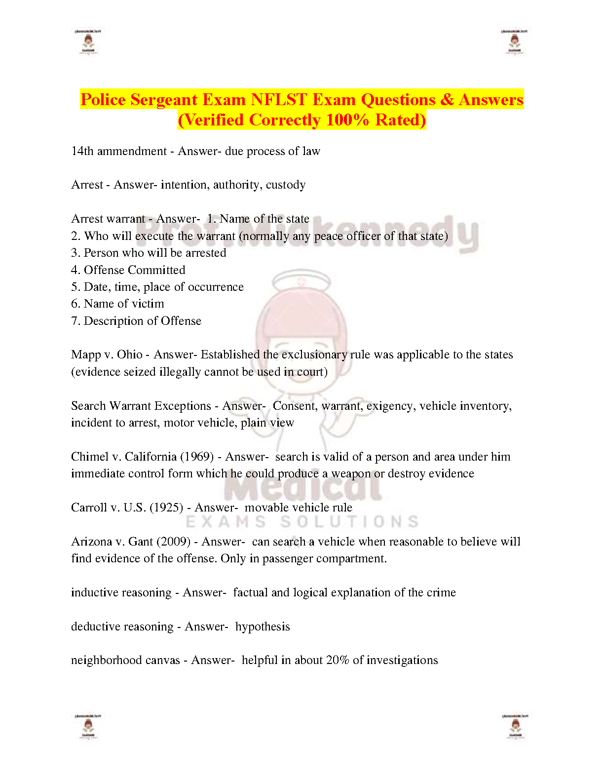 Ace your Police Sergeant Exam with this comprehensive guide featuring NFLST exam questions and answers. Verified for 100% accuracy, this resource covers key topics such as the 14th Amendment, arrest procedures, warrant exceptions, and various legal cases. Prepare effectively and avoid resits with this up-to-date 2024/2025 edition.