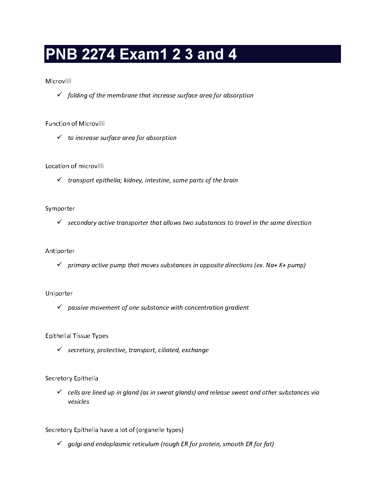Master PNB 2274 with this comprehensive study guide, designed to help you pass your exams on the first try. This 2024/2025 resource covers key concepts including microvilli, symporters, antiporters, uniporters, and epithelial tissue types. Avoid resits and achieve exam success!