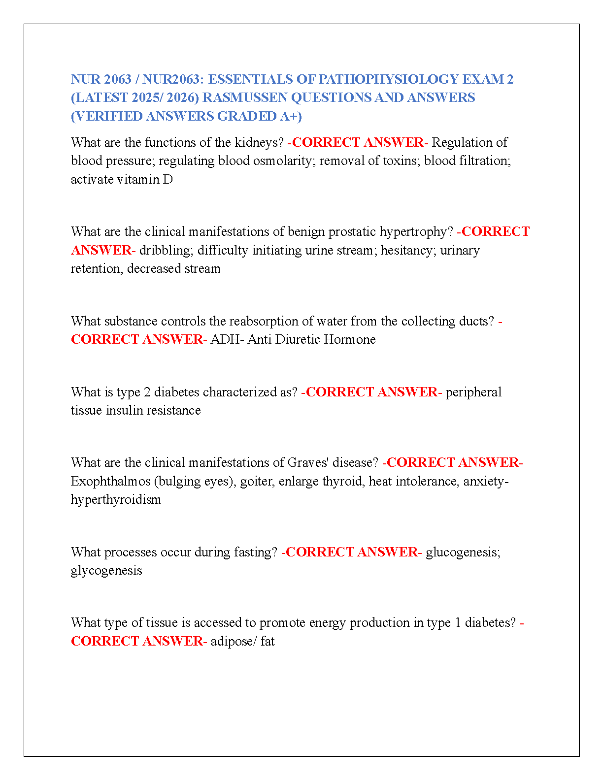 Ace your NUR 2063 / NUR2063 Essentials of Pathophysiology Exam 2 with this comprehensive question and answer resource. These verified answers, graded A+, cover key topics including kidney function, benign prostatic hypertrophy, diabetes, and more. Perfect for students aiming to pass on their first attempt.