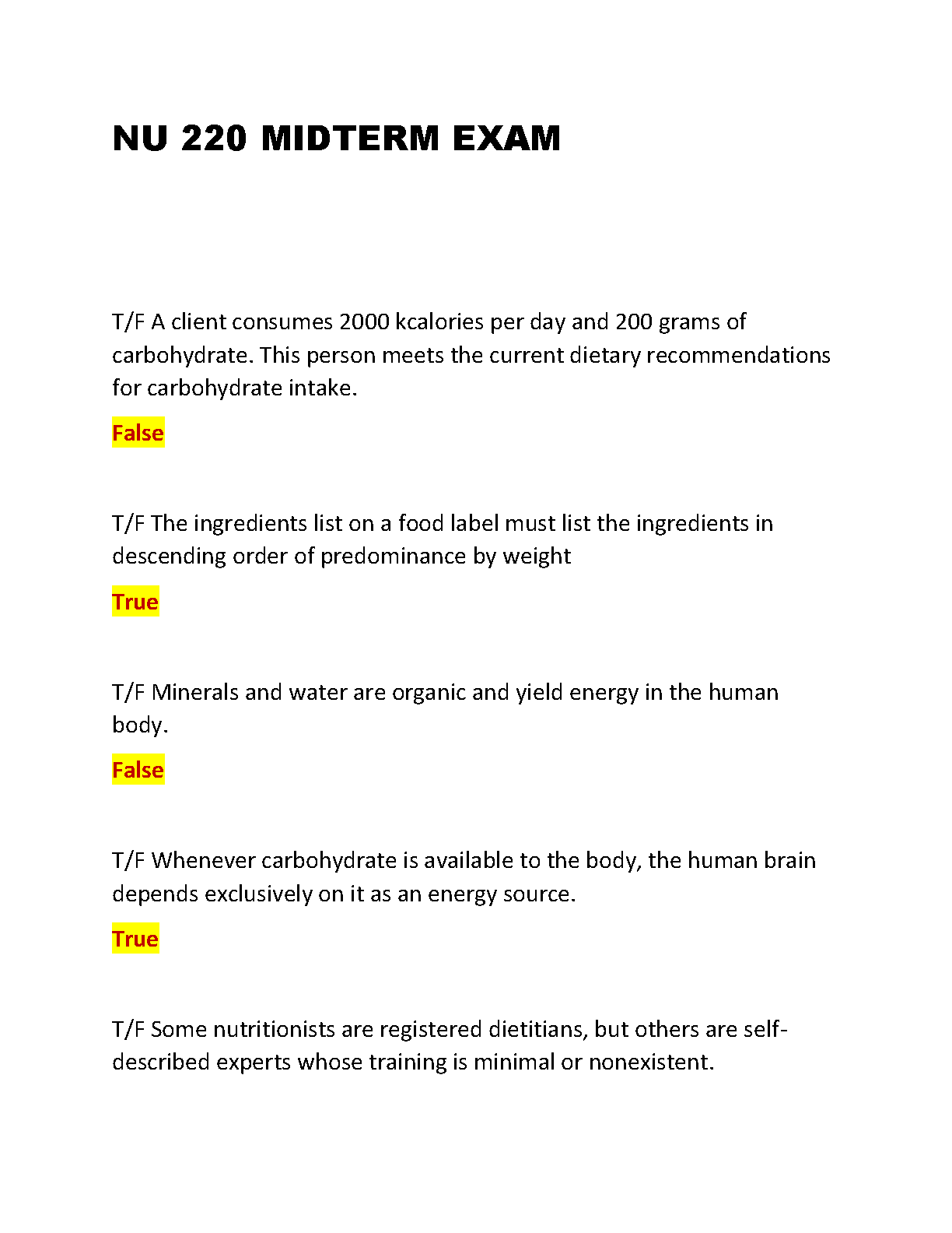 NU 220 Midterm Exam: Ace Your Nutrition Exam with This 2024-2025 Study Guide