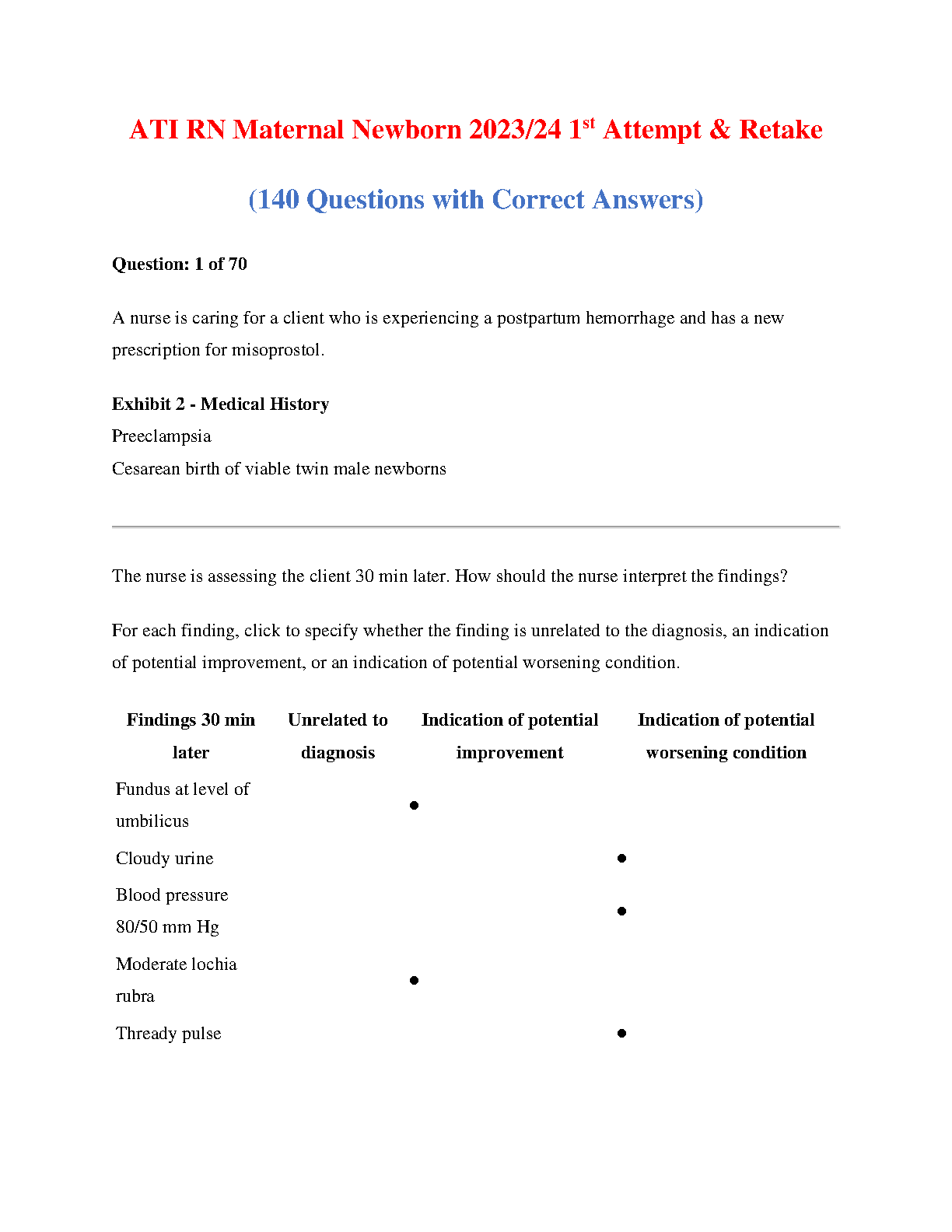 Ace your ATI RN Maternal Newborn exam with this comprehensive study guide. Featuring 140 questions with detailed answers, this resource is designed to help you pass on your first attempt, avoiding costly resits. Perfect for the 2023-2024 academic year.